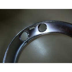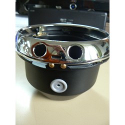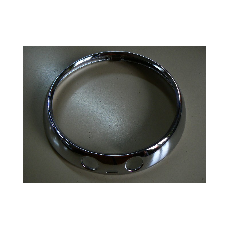 Entourage de phare chromé de type DUCELLIER. Maintien sur le cuvelage par un ergot en haut et 2 pions en bas (sur le cuvelage). Il y a 2 trous en bas de l'enjoliveur pour passer les doigts pour la dépose. Compatible avec le cuvelage vendu sus la ref "5014cibié". Enjoliveur vendu seul. Photos contractuelles.