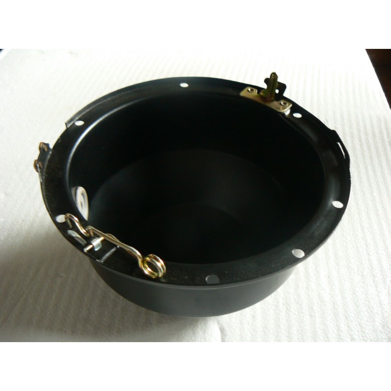 Cuvelage de phare de type Cibié. Le maintien de l'enjoliveur chromé se fait par les 2 ergots ressorts en bas du cuvelage (voir 2ème photo). Photo contractuelle. Enjoliveur chromé vendu à part ref "5011Cibié"