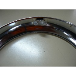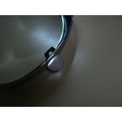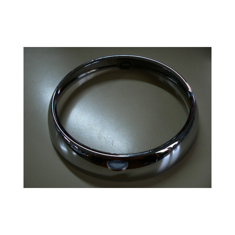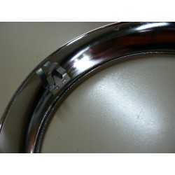 Entourage de phare chromé de type Cibié. Maintien sur le cuvelage par un ergot en haut et 1 ressort en bas, tous deux sur l'enjoliveur (voir 3ème photo). Extérieurement, il y a un ergot en bas de l'enjoliveur pour tirer dessus lors de la dépose. Enjoliveur vendu seul. Photos contractuelles.