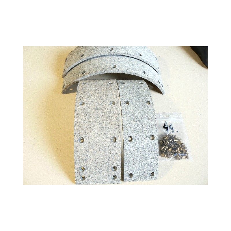 Jeu de 4 garnitures de freins + rivets pour l'AV des simca Vedette V8 en roues de 13 pouces, 2ème série : Versailles Trianon Régence Marly, à partir du numéro de série 45281 jusqu'à 61. Important : 2 largeurs dans un même tambour !! Dimensions 250X50 et 236X63.