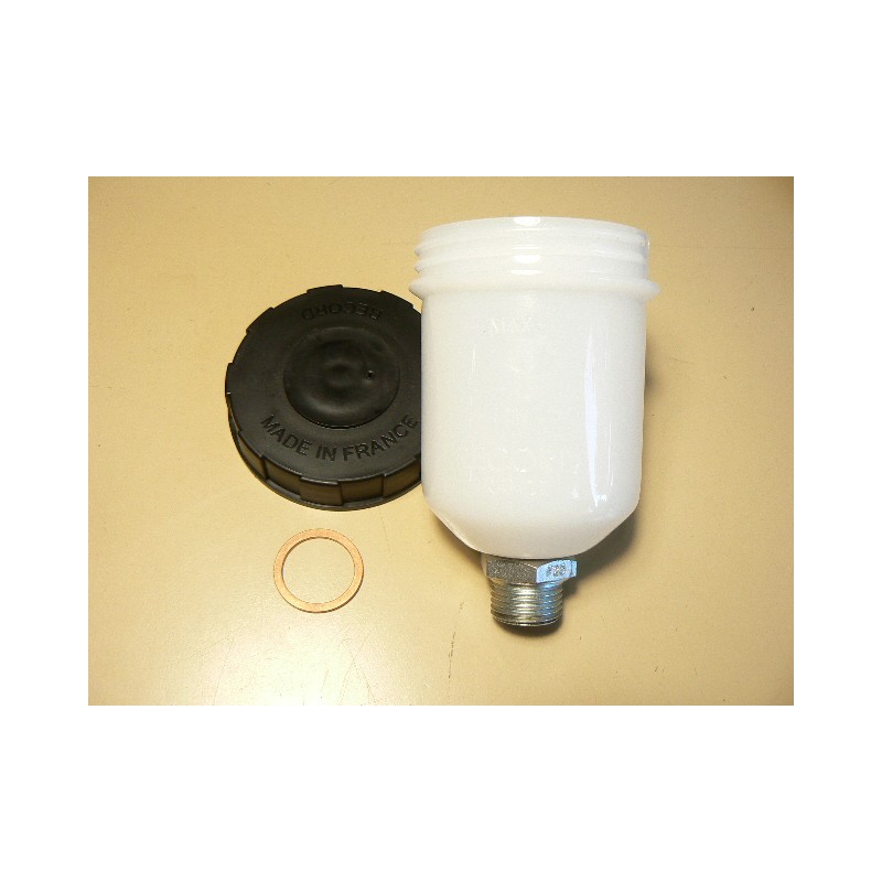 Réservoir de liquide de freins plastique vissé sur maitre cylindre. Vis de diamètre 19mm. Remplace le bocal en verre Nivoclair vissé directement sur le maitre cylindre.